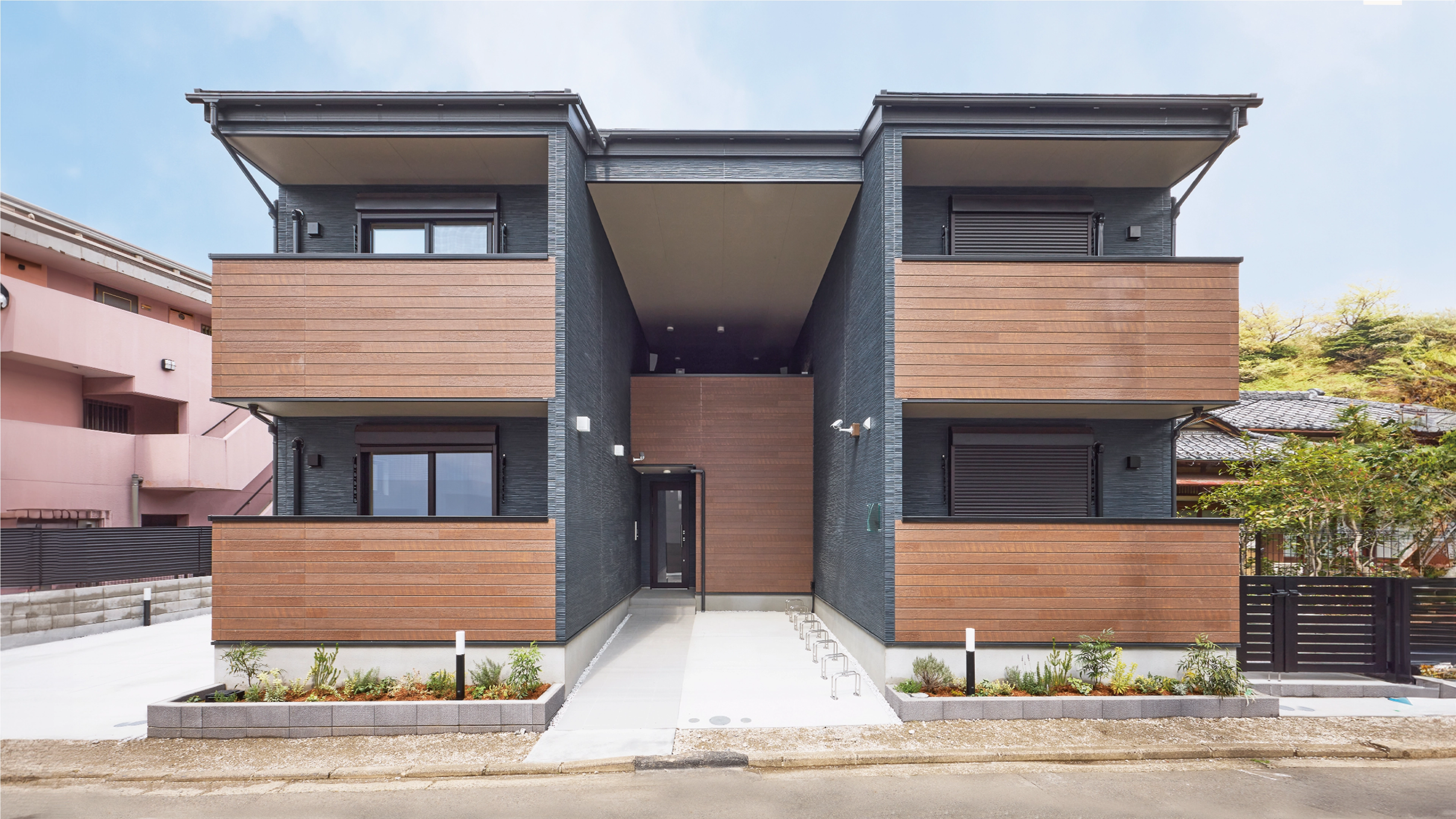 品のあるダークネイビーの外観に、ポイントとしてあえて素材の違う木材をプラス。高級感の中にどこかぬくもりを感じさせる外観が印象的な物件です。シンプルなスクエア型は無駄な装飾がなく、飽きのこないデザインを叶えました。品質やデザインに妥協することなく向き合っています。