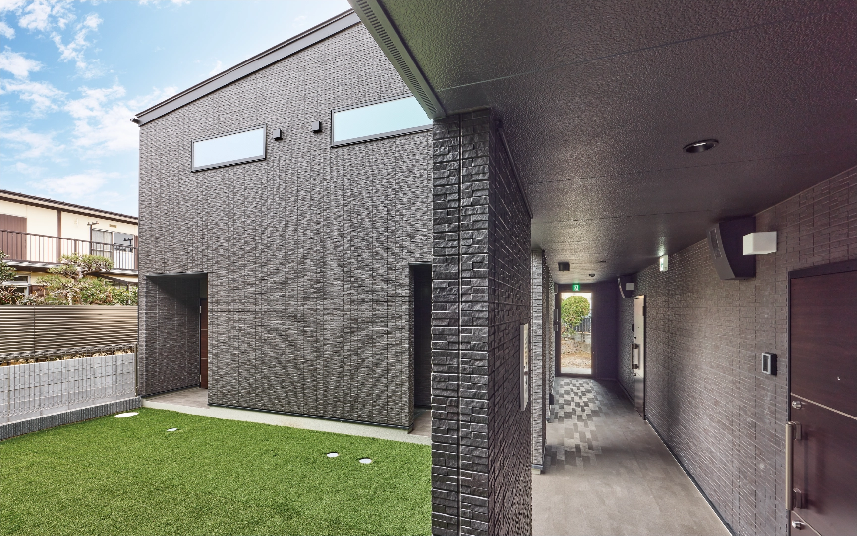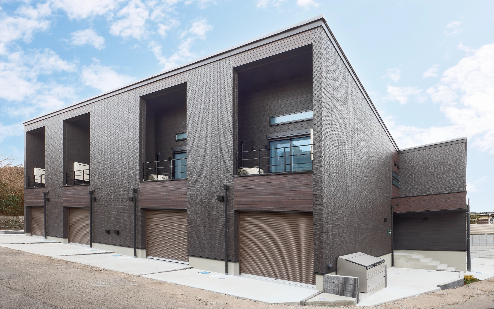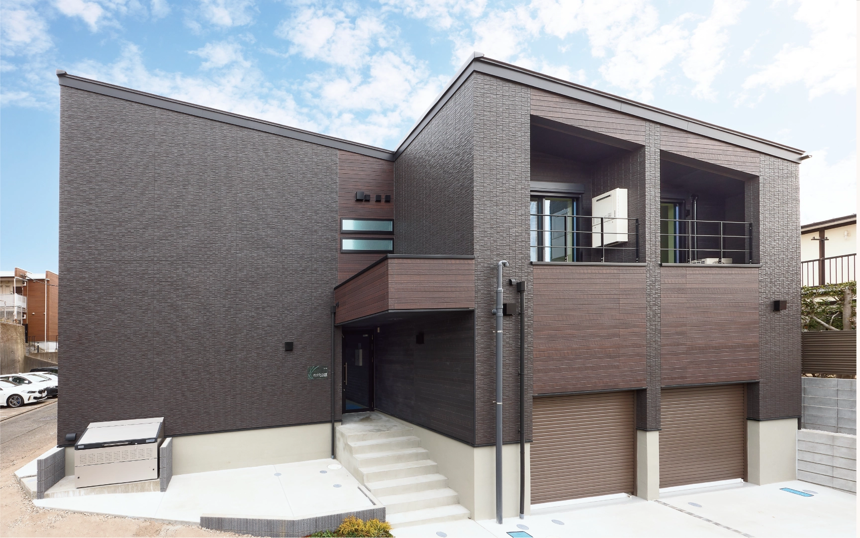シャープな片流れ屋根が目を引く外観に、外壁は落ち着いたダークブラウンで、存在感のあるデザインです。さらに、全住戸に専用ガレージを設け、住居者がガレージからスムーズに荷物の積み下ろしを行える動線を確保しています。海の近い湘南エリアでドライブを楽しみながら、自宅に帰ってきてビルトインガレージが出迎えてくれる、そんな憧れの快適な暮らし方ができます。