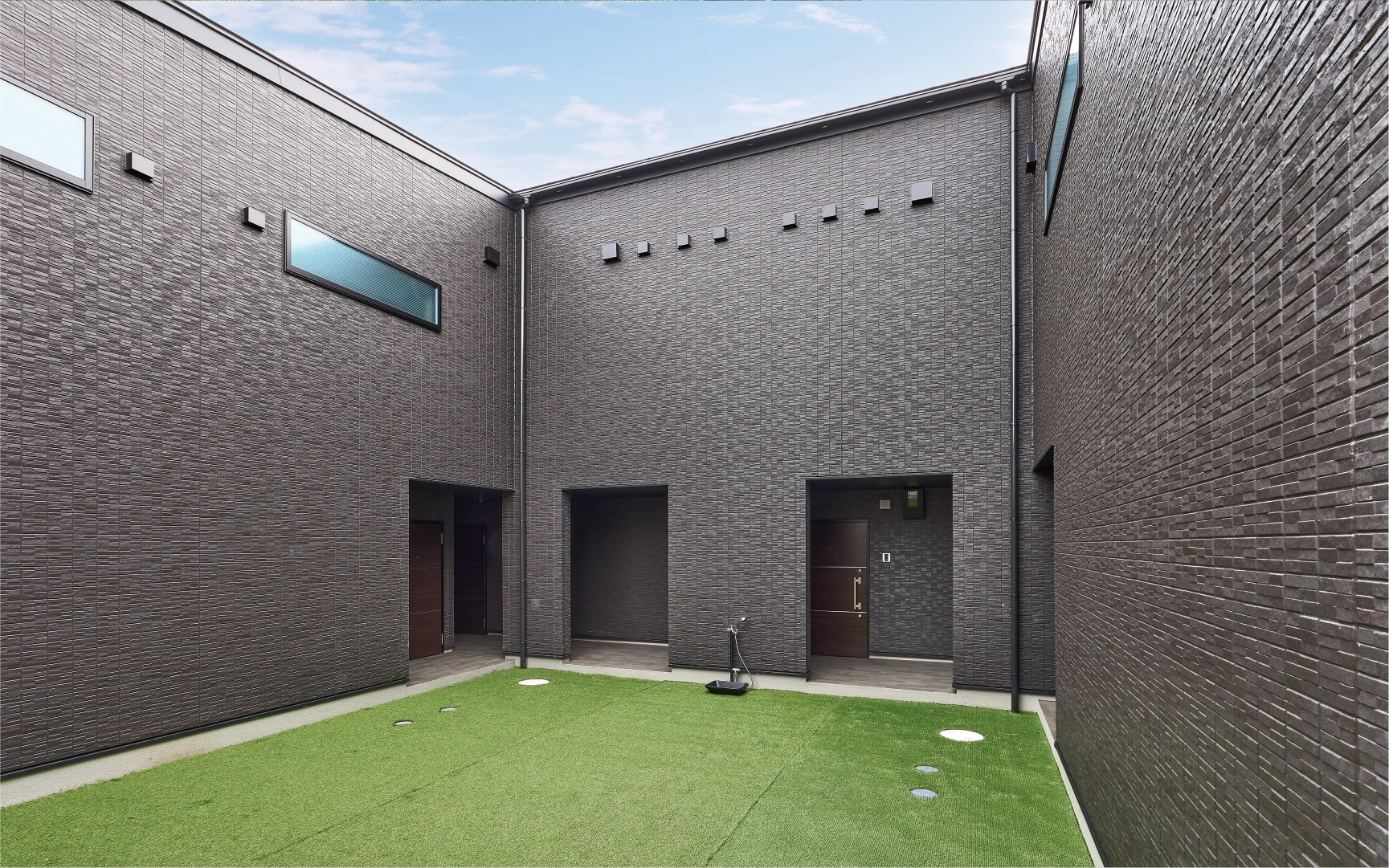 道路と宅地の高低差を活かした特徴的なアパートプラン。高低差を利用して設計した1階のガレージからは、建物内にスムーズに移動できる動線を確保することで、居住者にとっての利便性も重視しています。また中庭には人工芝が敷かれたドッグランや散歩の後に汚れた足を洗える屋外ペットシャワーなど、ペットとの共生を重視した設備も完備しています。