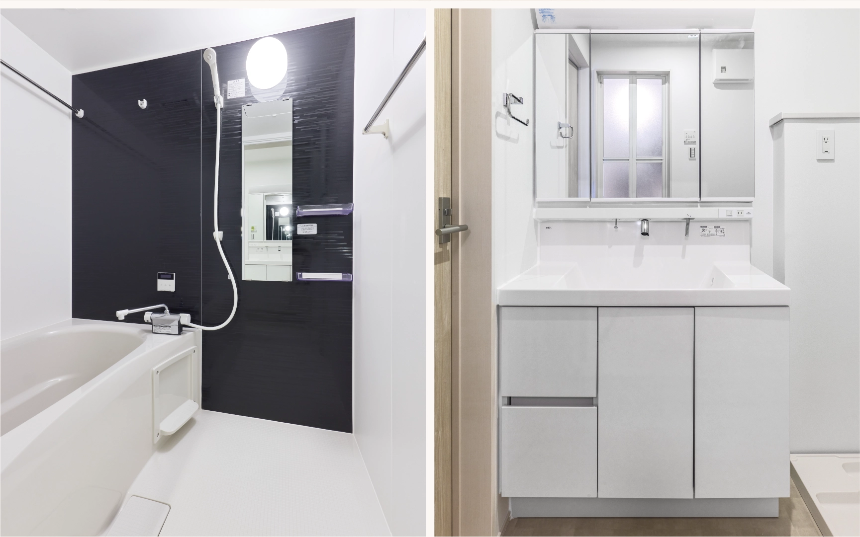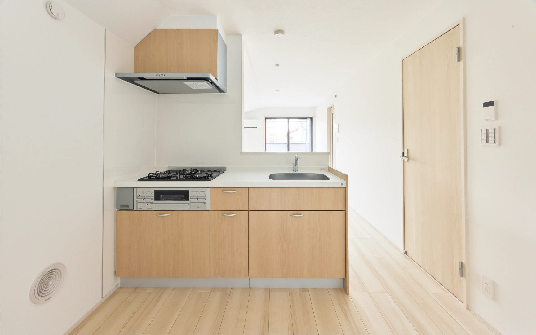 多様なライフスタイルに合わせて入居者にとってうれしい設備が充実。インターネット完備や宅配ボックス、3口ガスコンロはもちろんのこと、追い炊き機能付きのお風呂やゆとりを持って使える広い洗面室を採用することで住まいやすさを追求しています。また、自然と会話が生まれる対面キッチンには、デザイン性が高く、雰囲気をオシャレに見せてくれる人工大理石ワークトップを取り入れました。