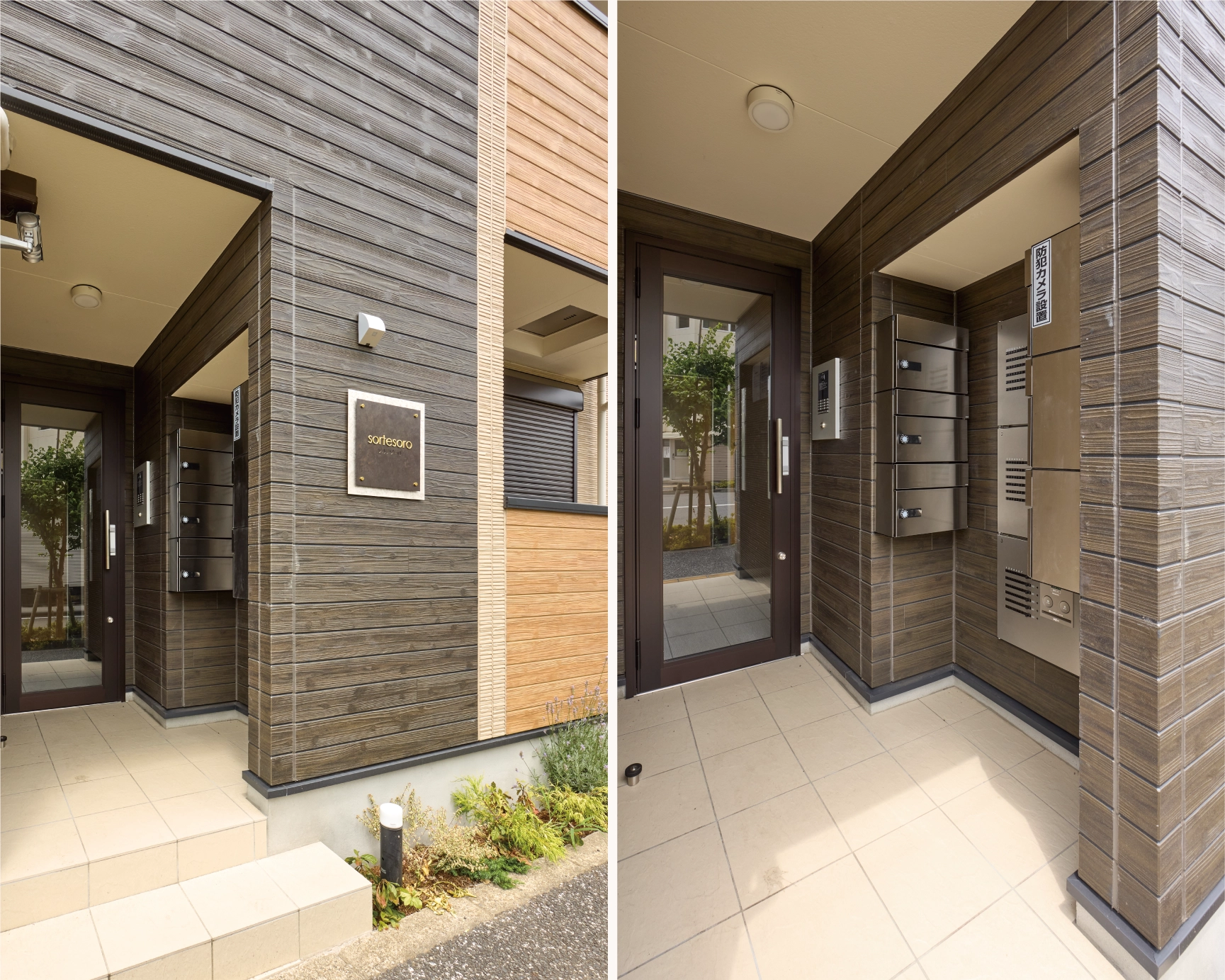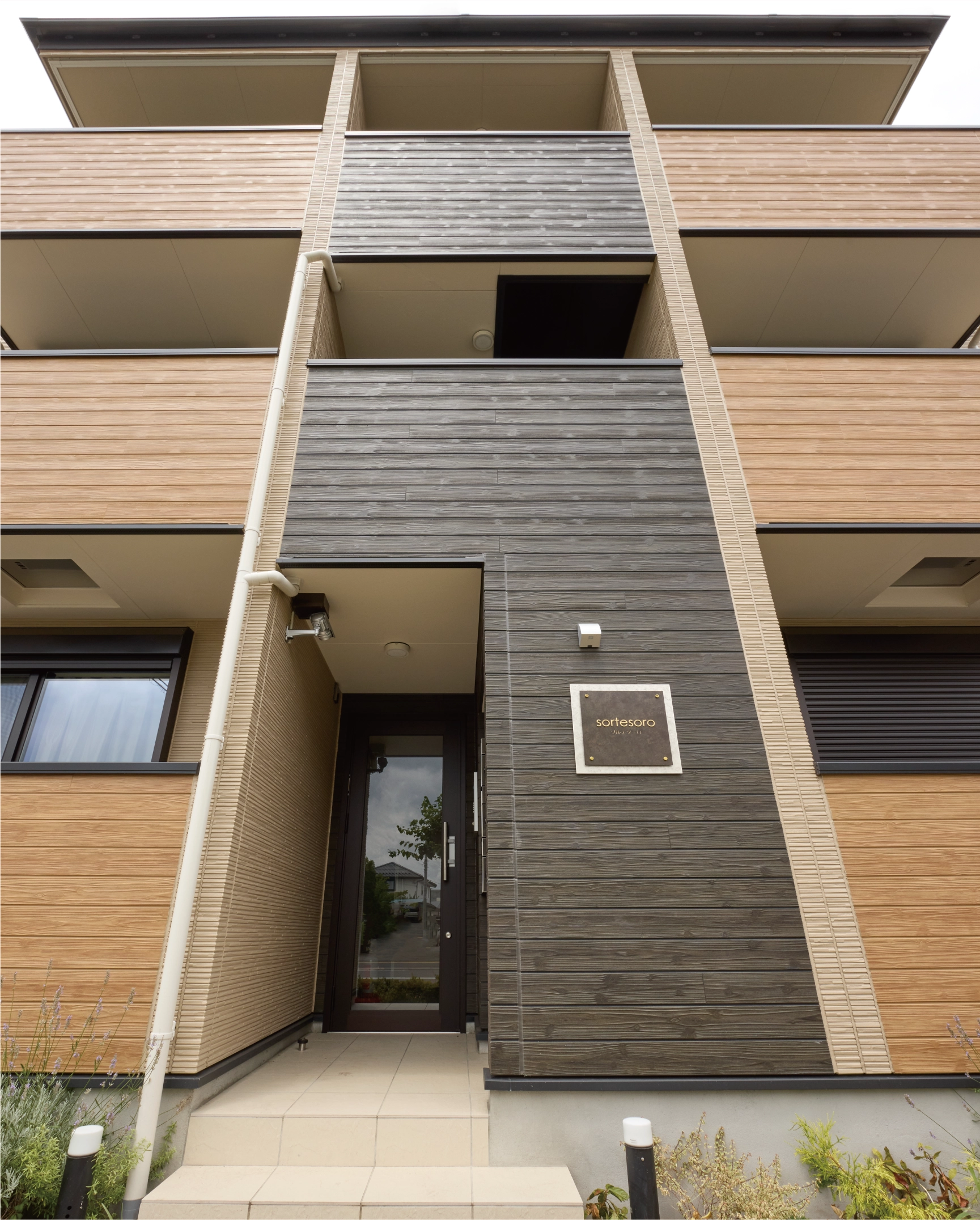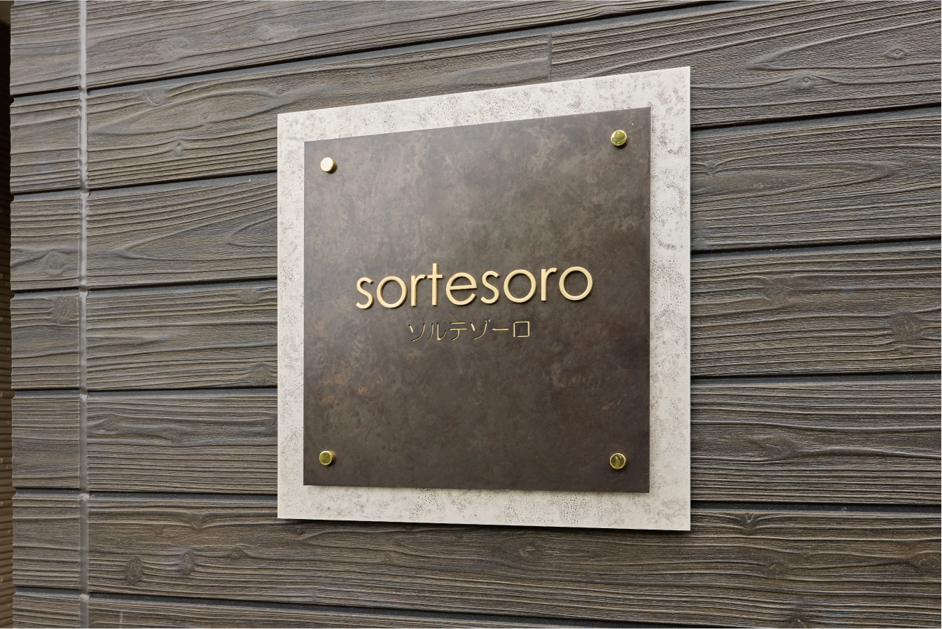 施主様こだわりの館銘板は品のある白と茶色のコントラスト、金色の化粧ビスが印象的なデザインです。柔らかな色味のアパート全体に高級感を与え、外観や街並みに彩りを添えています。