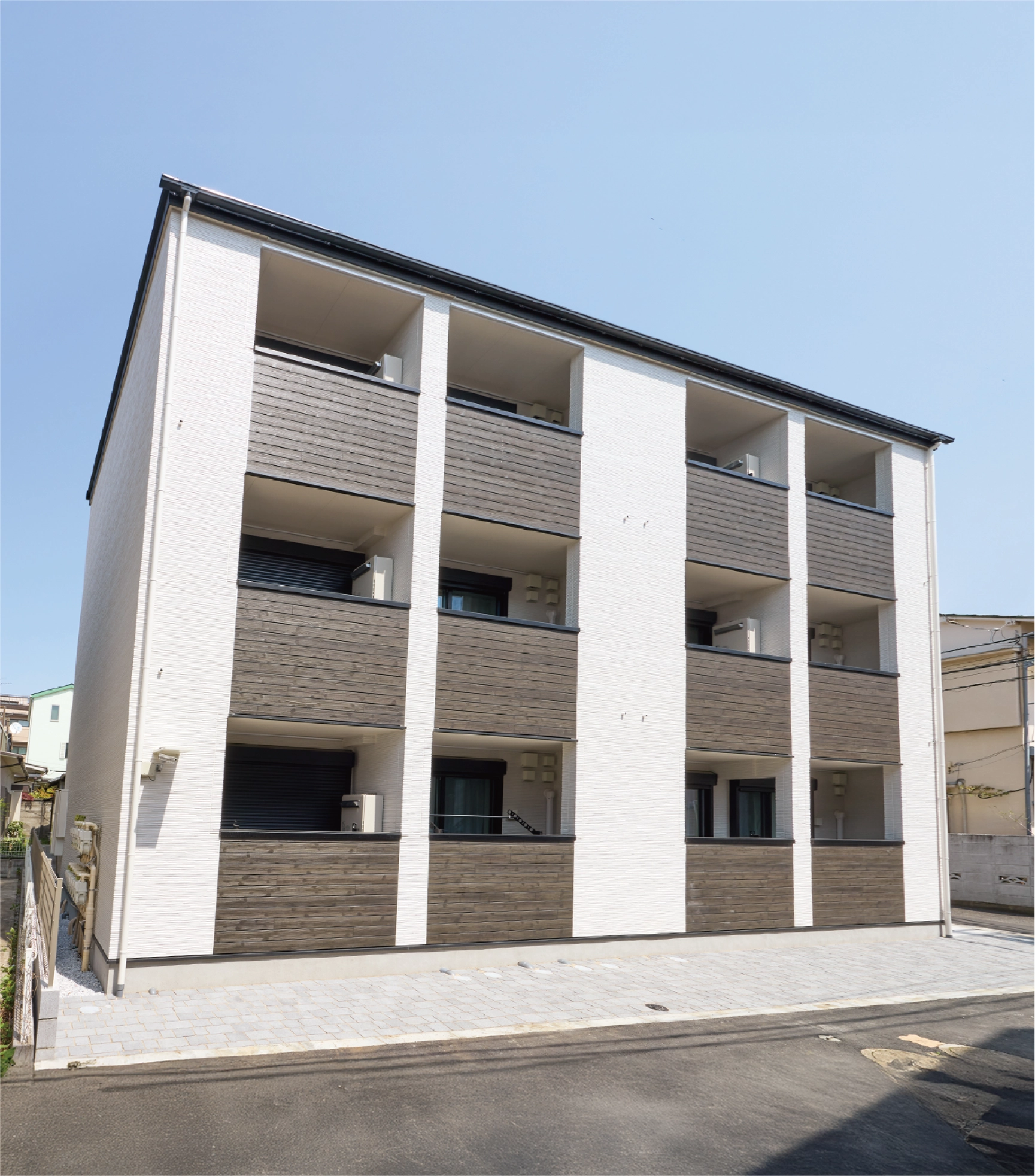 徹底した周辺調査から学生の多い周辺環境や都心部へのアクセスの良さに着目し、女性の初めての一人暮らしを想定した女性専用のコンセプトアパートを提案。都内に多い1Rでありながら、需要にマッチした設計デザインが人気を集めたことで即日全戸満室となり、高収益のアパート運営を実現しています。