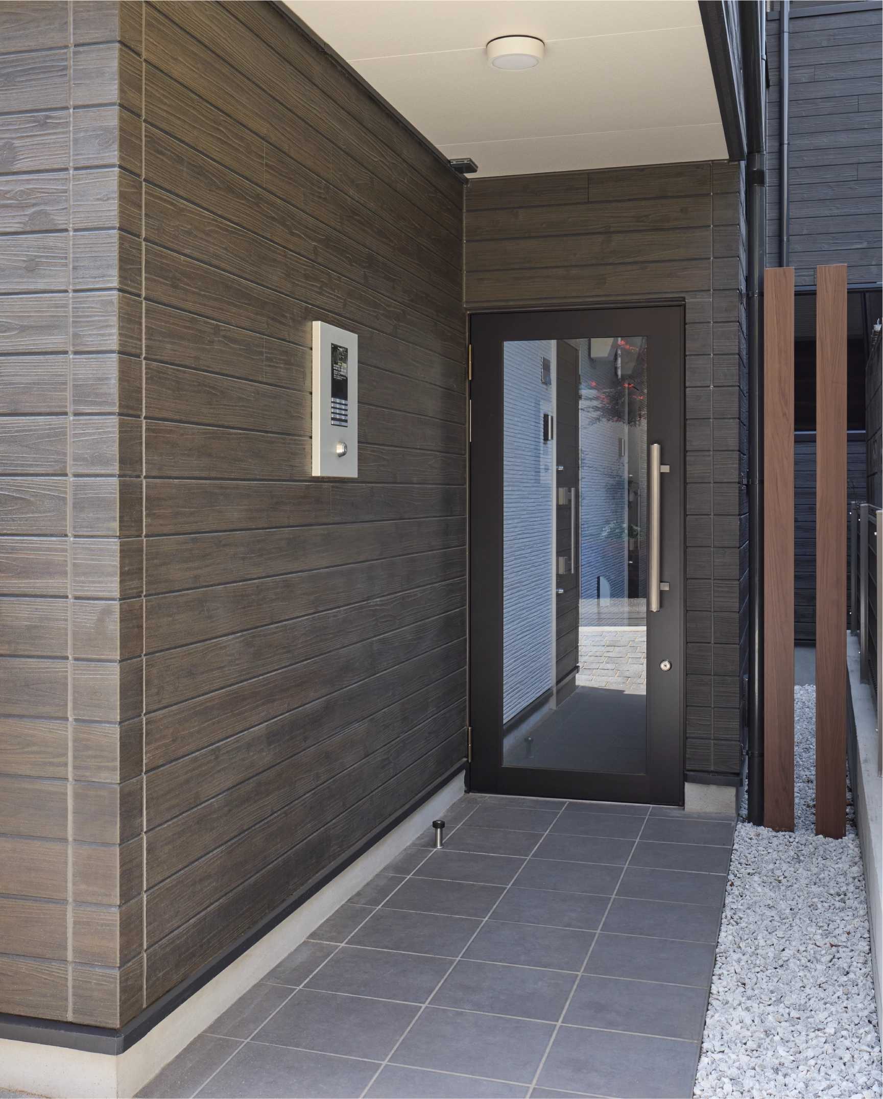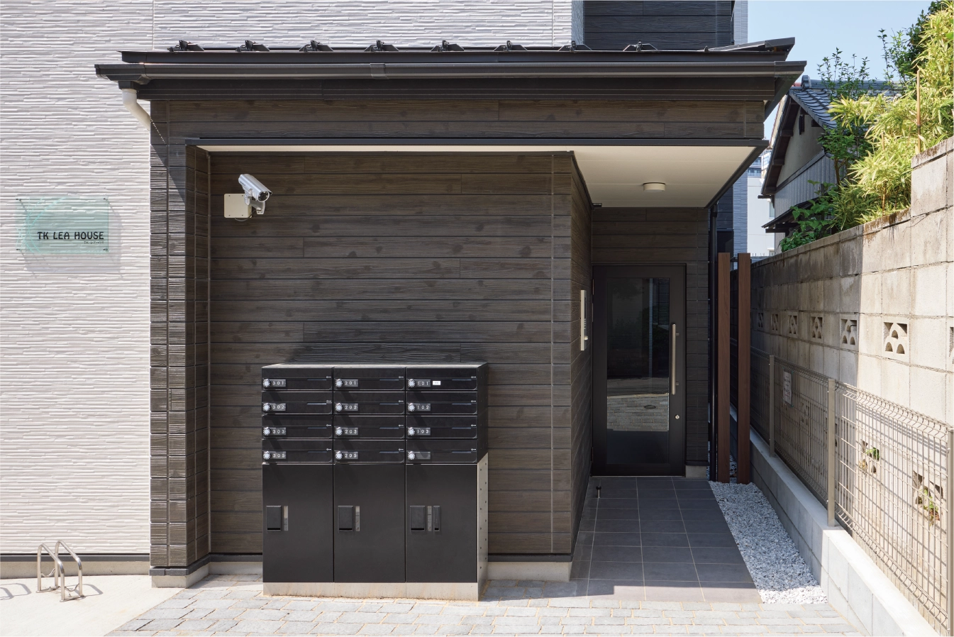 アパートの顔となるエントランスは、ダークウッドのカラーでまとめたこだわりのアプローチ空間。帰ってきたときに心地よく迎えてくれる上質なデザインです。また細部にまで配慮した高い防犯性と、管理人が駐在することで居住者が安心できる生活をサポートします。