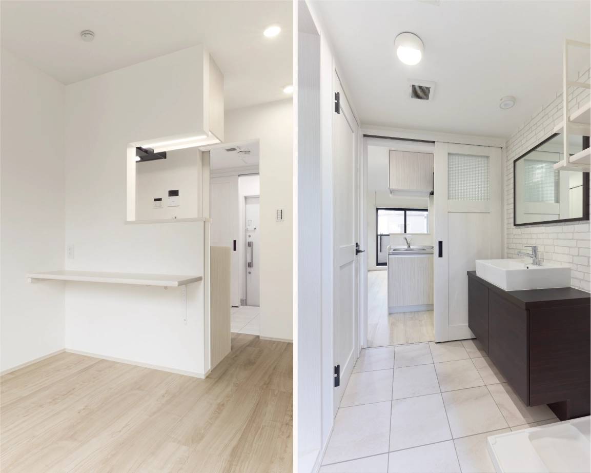 たっぷり収納できる大きめのクローゼットや食事スペースとしても使える対面キッチン前のカウンターテーブル、料理のバリエーションを増やせる2口ガスコンロやグリルなど楽しく一人暮らしのスペースを有効に使えるアイデアが満載です。動線に配慮した使い勝手の良い収納スペースを完備した洗面所は白いレンガ調の壁紙で室内にエレガントさを与えてくれます。また玄関にある框の洋風引き戸によりプライベート空間を十分に確保できます。