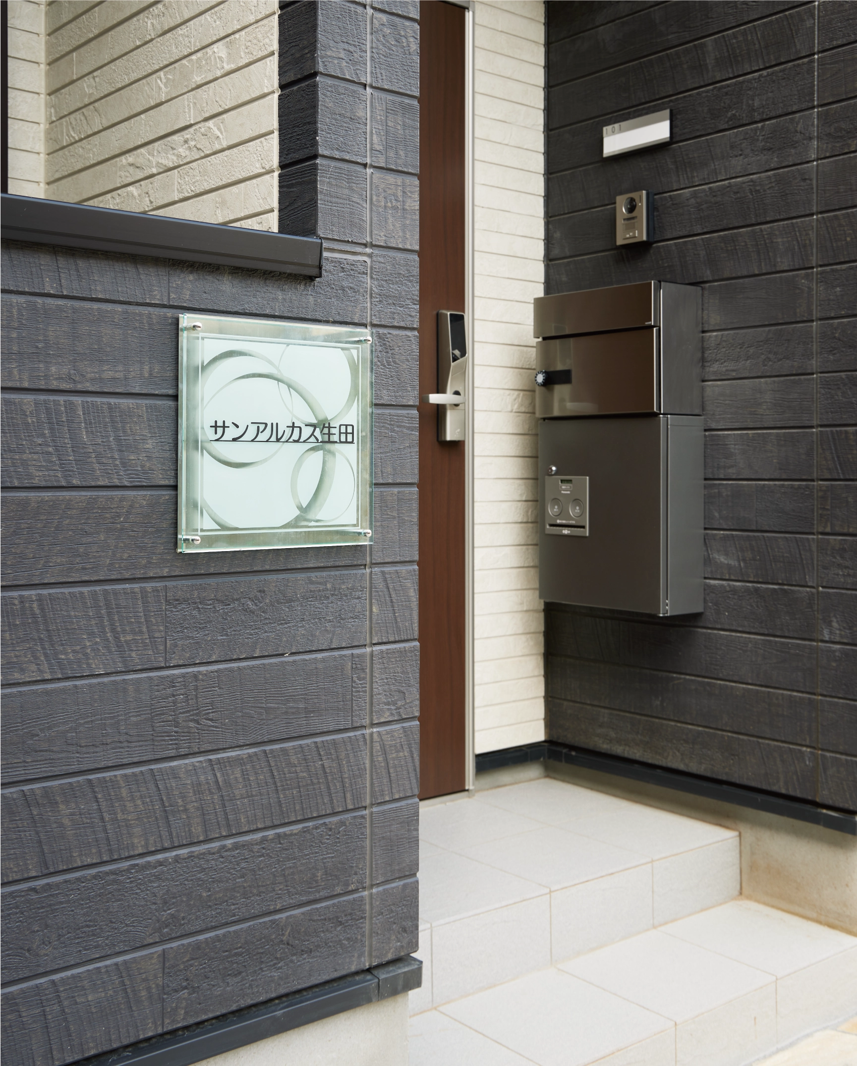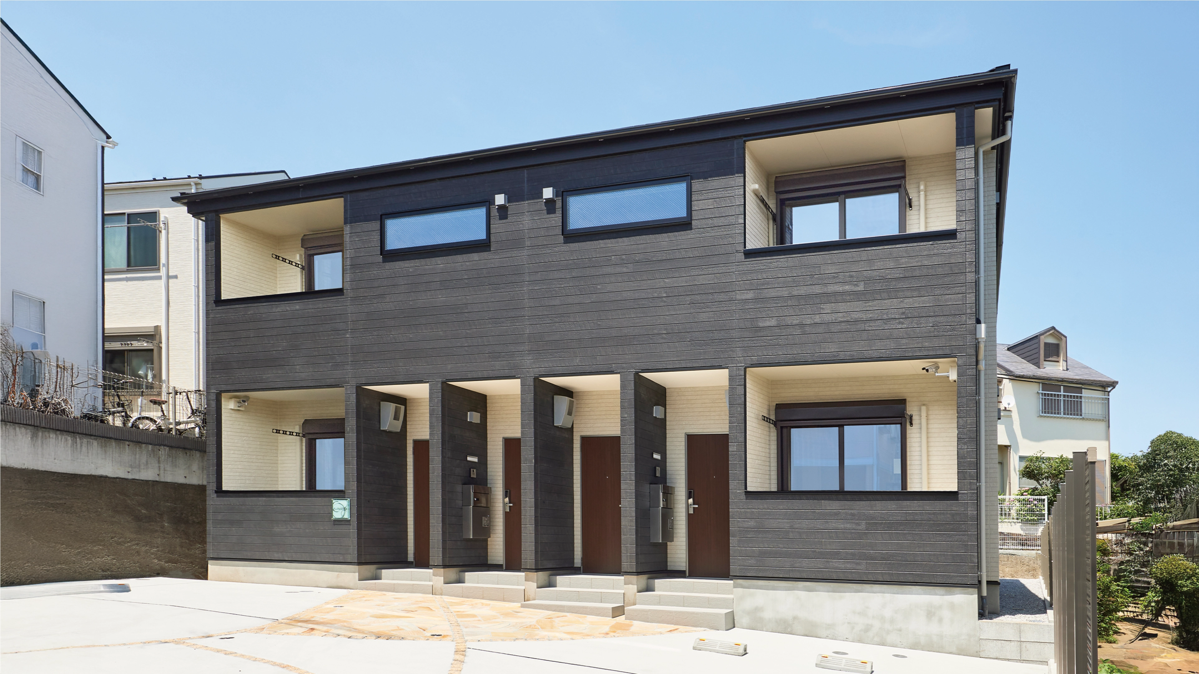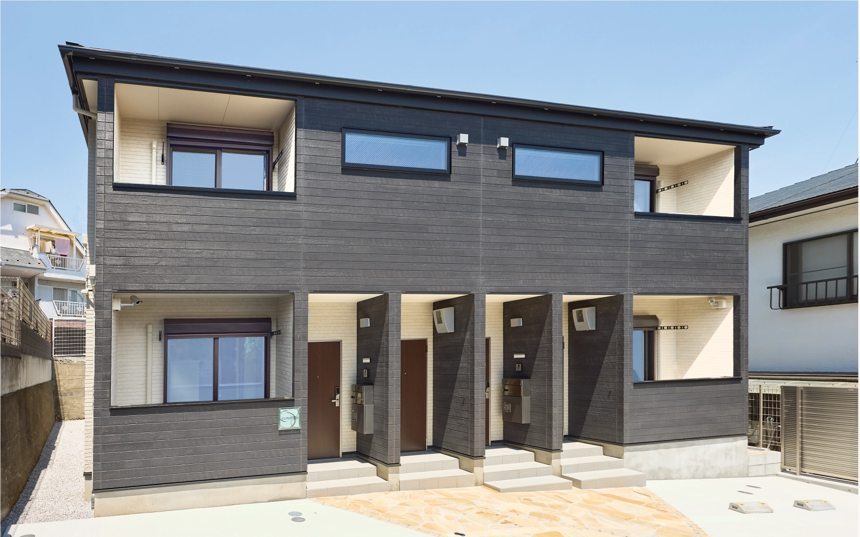 落ち着きのあるグレー色をアクセントにバルコニー内を明るいオフホワイトにすることで、シンプルでありながら品の良さを感じる外観です。さらに、地中埋め込みのアプローチライトが入居者の帰りを温かく迎え、彩りのある乱形石貼りのエントランス外構がアパートの美しさを引き立てています。